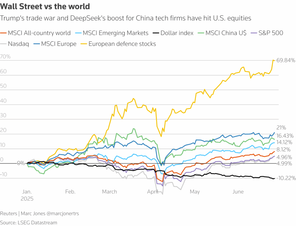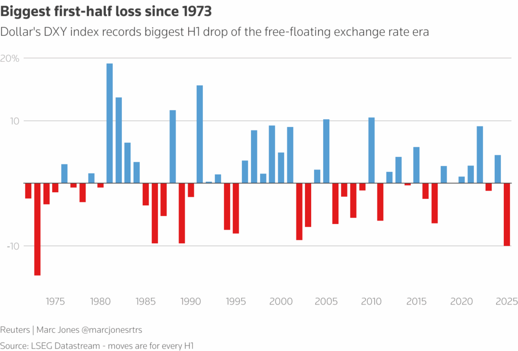 Americký dolar v prvním pololetí oslabil o více než 10 % – nejvíc od 70. let. Důvod? Očekávání měkčí měnové politiky v USA, politická rizika a snaha některých zemí méně spoléhat na dolar.